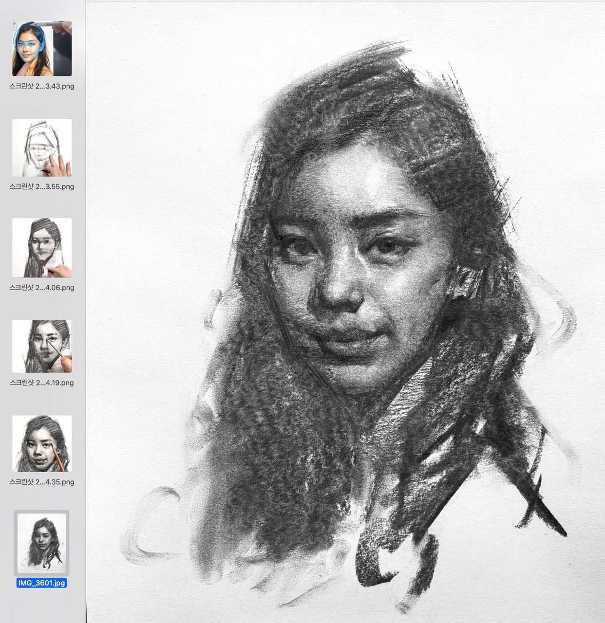 A step-by-step breakdown in high-resolution stills showing key moments of the drawing—gesture, block-in, tonal massing, edge control, and final details.