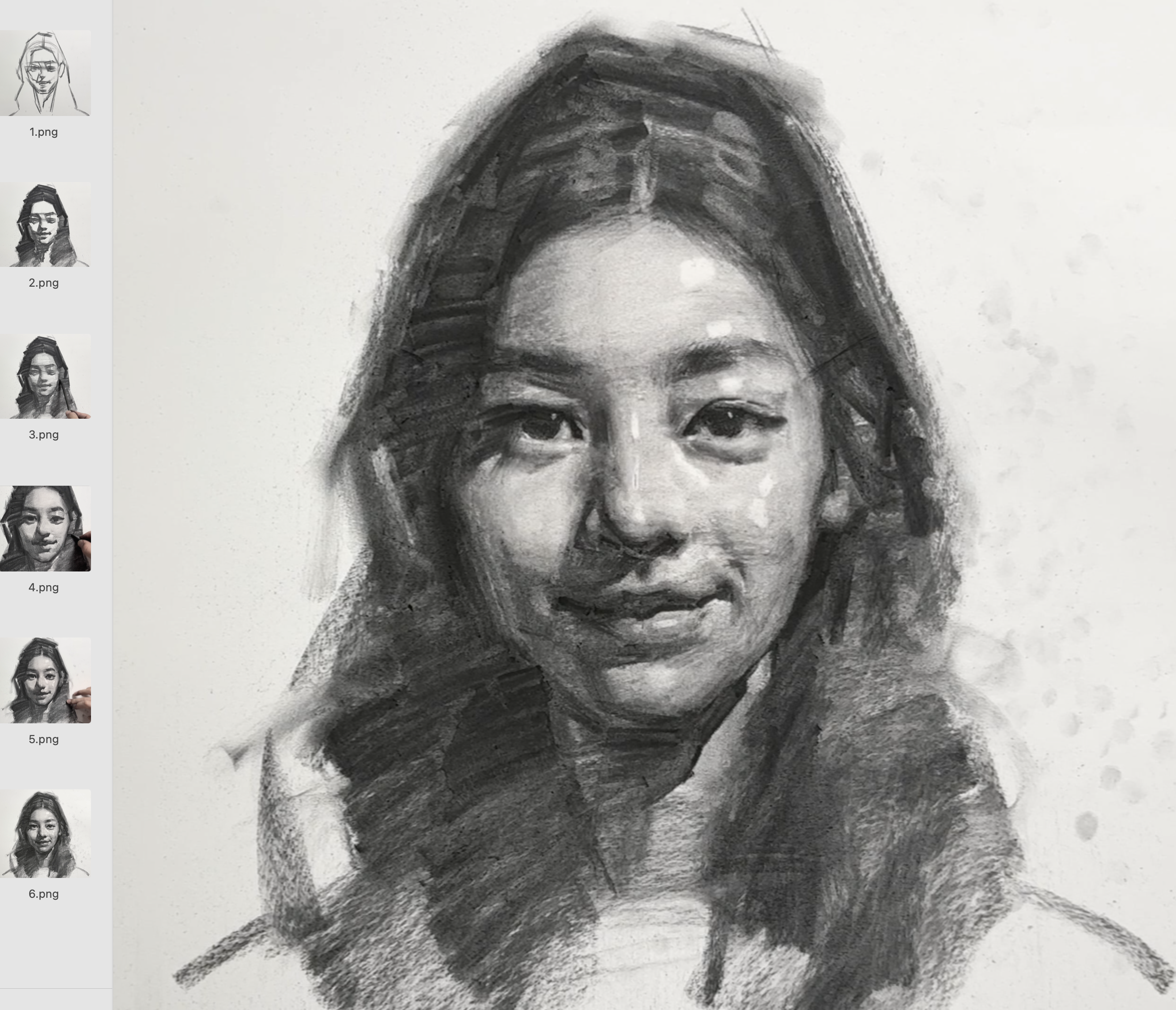 A step-by-step breakdown in high-resolution stills showing key moments of the drawing—gesture, block-in, tonal massing, edge control, and final details.